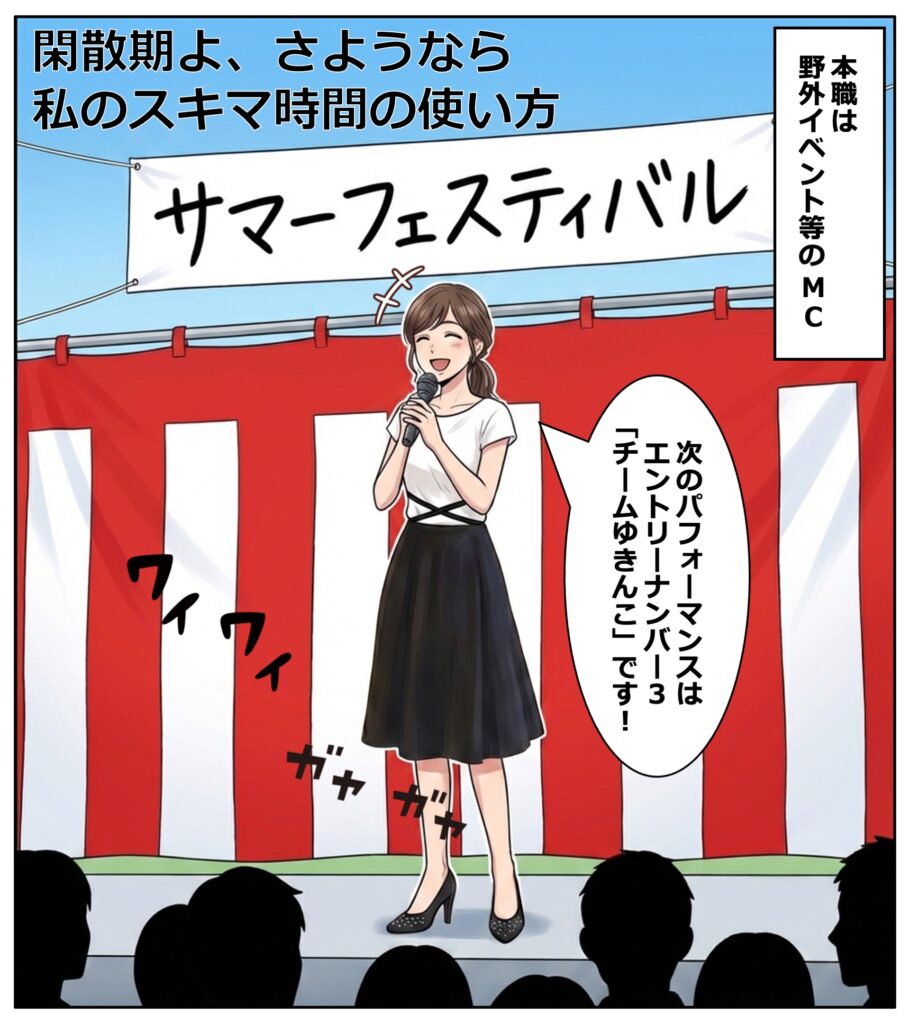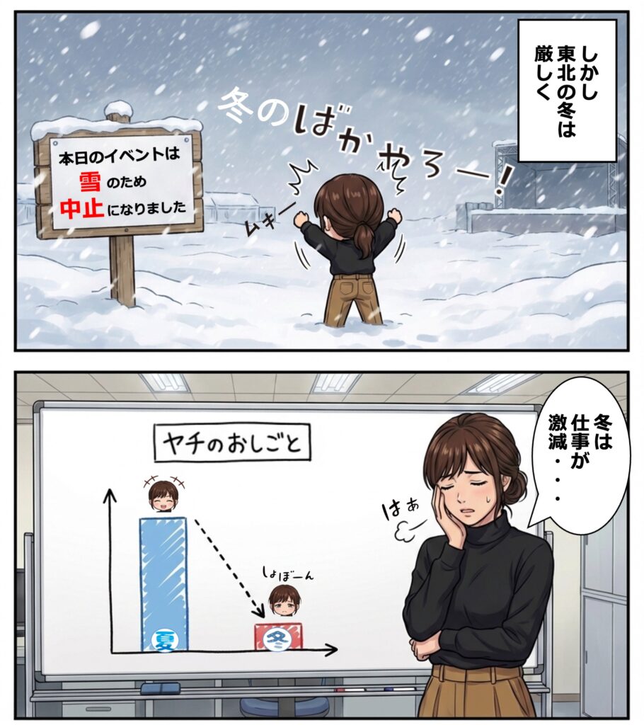 普段は青森県内でイベントの司会をしています。この仕事は忙しい時と暇な時の差が激しい業種で、特に冬は雪でイベントが減ってしまい、仕事がなくなることもよくあります。フリーランスなので、仕事がないと「ただ家にいるだけの人」になってしまい、やっぱり不安になる部分はあります。