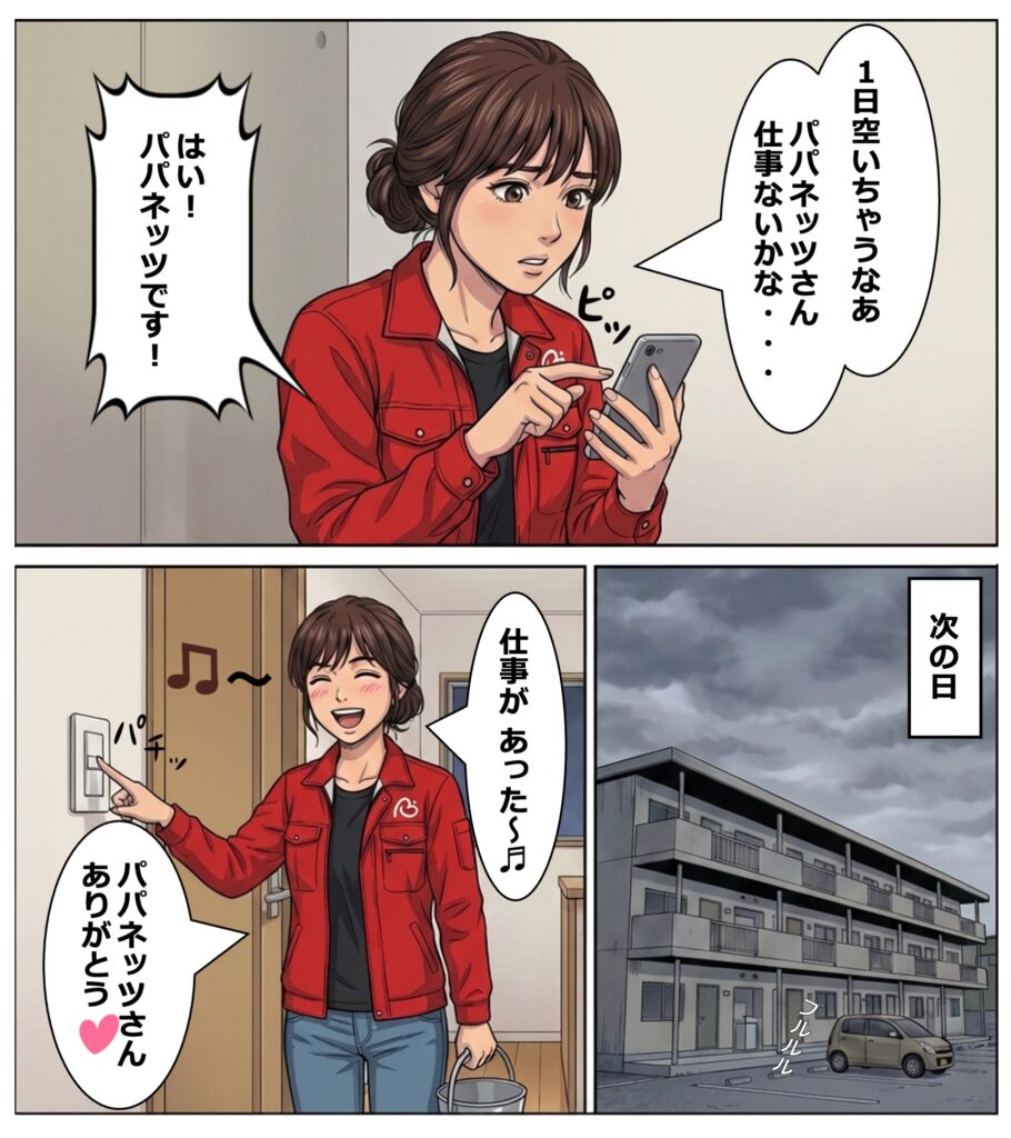友人はパパネッツから、部屋の点検作業を請け負っていました。八戸市を一人で担当していたのですが、2月、3月の引越しシーズンは入居者が多く、点検依頼がぐんと増えます。雪のため移動も大変になります。特に友人は子どもが小さく、2月、3月は風邪をひきやすい時期なので、一人では精神的にも体力的にも大変そうでした。
